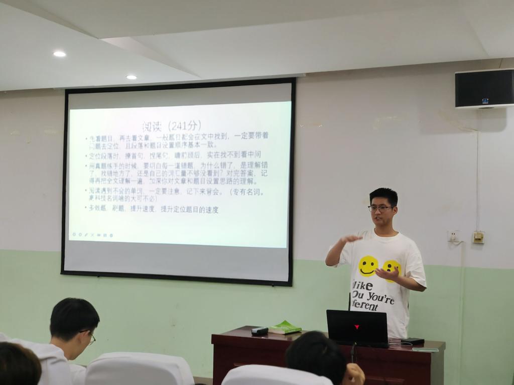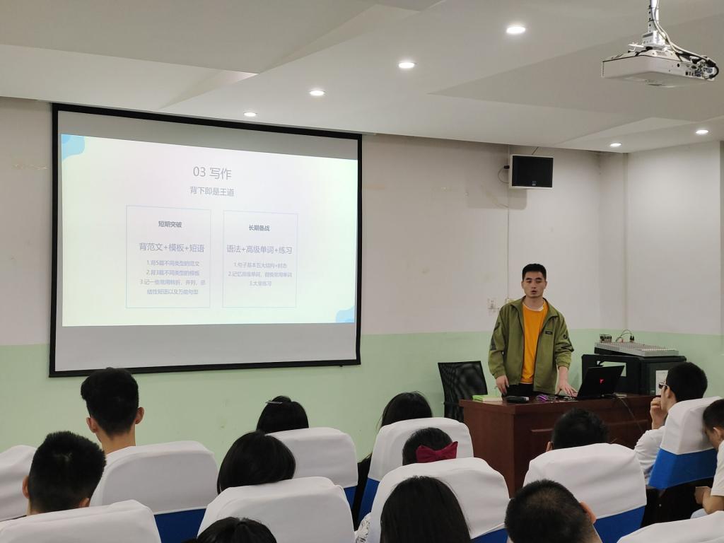 本次活动邀请了学生党员夏国轩、董博,学生代表焦国祥三位学长,他们英语四级成绩均以500分以上的高分通过,交流会上,三位学长分别从英语四级考试流程、题型、答题技巧、词汇记忆方法等方面进行了经验分享和交流,并现场解答了大家的问题。