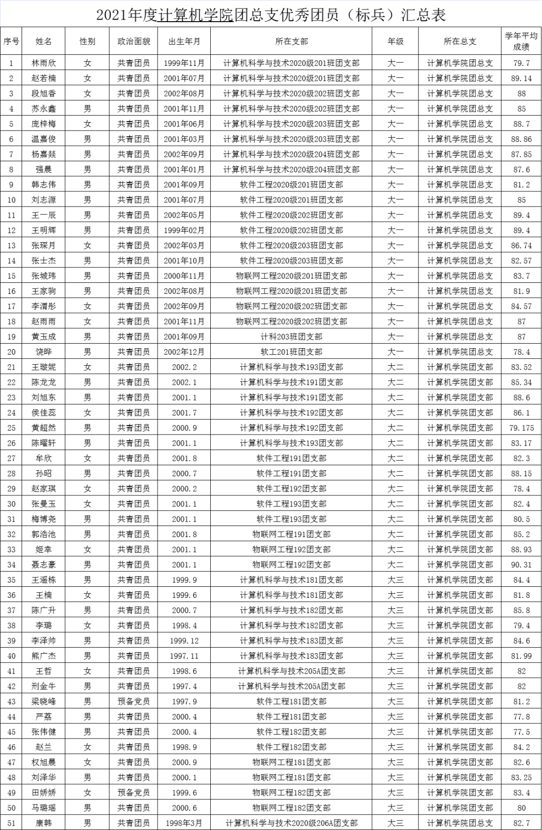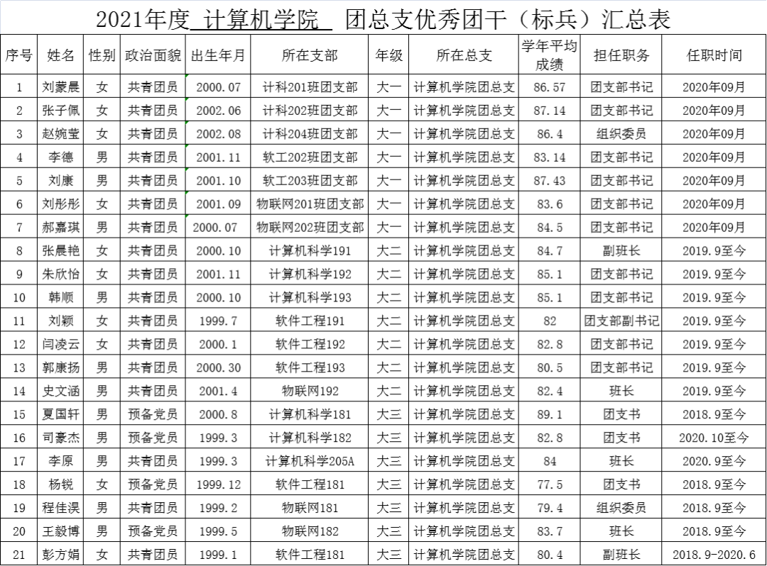 按照校团委《关于开展2021年度今年会官方网站共青团先进集体和优秀个人的评比表彰》文件要求,计算机学院团总支已全部完成评比工作。各班级团支部依据支部投票结果评预推荐对象,学院团总支结合团支部青年大学习、主题团日活动、团员团干日常考核、团支部建设等情况,全面并根据上一学年考试成绩进行最终评定,确定最终推荐对象。现将拟订优秀团员(标兵)、优秀团干(标兵)、优秀团支部和星级志愿者名单进行公示。