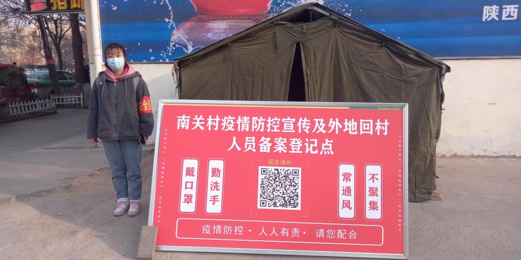 为积极响应家乡疫情防控号召,王璇妮同学在假期返乡后主动向村里报名志愿者,成为了咸阳市长武县昭仁街道办南关村的一名大学生志愿者。在防疫期间,她和其他志愿者一起进行防疫工作,主要负责村口执勤及外来人员的扫码登记等工作。