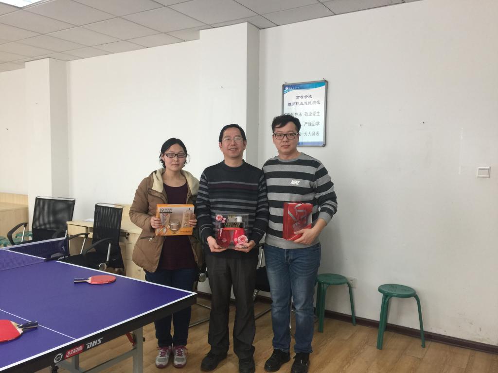 本次友谊赛秉着公平、公正、公开的原则,采用单淘汰制,通过抽签分为3组进行。现场的气氛十分的活跃,直拍、横拍、扣球、旋转球、弧线球等频频出现,比赛中不时传出热烈的喝彩声。历经近3个小时激战,杨俊清老师技压群雄,一举夺得冠军,亚军、季军分别为王倩丽和米嘉琪。本次比赛在一片和谐欢笑中圆满结束。