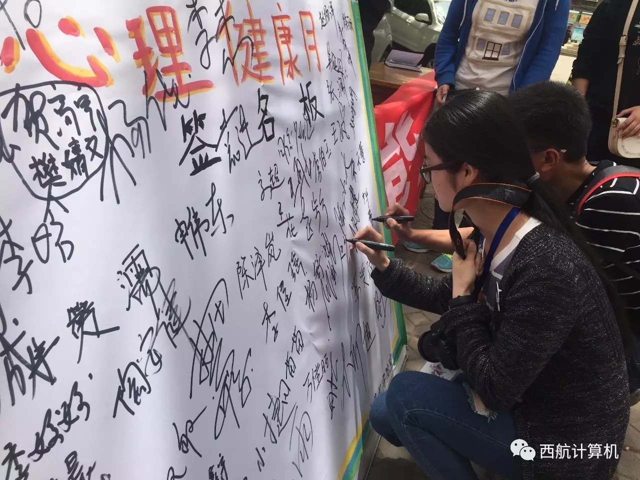 伴着悠扬的歌曲,工作人员装扮成玩偶与同学们互动,向大家宣传心理健康知识,现场的气氛活跃而轻松。通过讲解和学习,同学们更加深刻地了解了心理健康的重要性,学会了如何调节心态,以积极向上的态度面对生活。之后,参加活动的同学纷纷在宣传板上签名,表达了自己对大学生心理健康活动的支持。同学们表示,通过此次主题活动学会了如何去面对自身的不足,关心爱护身边的人,以更饱满的活力去学习和生活。