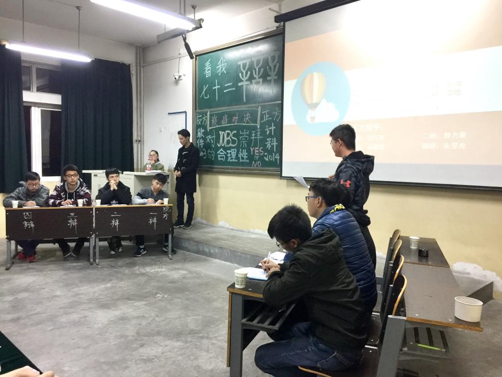 决赛的辩题为:对乔布斯崇拜的合理性。两班都派上了自己最强大的阵容,展开了激烈的角逐。比赛过程激动人心,各班的辩手们配合默契,妙语连珠,他们旁征博引,将整个比赛带入了一个又一个高潮。经过一个多小时的激烈辩论,计科2014班代表队最终赢得了比赛。在一段精彩的街舞和吉他演奏之后,冠军队和联合队就“爱与被爱谁更幸福”这一主题进行表演赛。辩手们灵活的思维、生动的语言赢得了大家阵阵掌声。经过评委们的认真评选,吕行方和朱昱光两名同学获得“最佳辩手”称号,辅导员兼评委团成员耿申分别为获奖的班级和选手颁发了奖状和荣誉证书。
