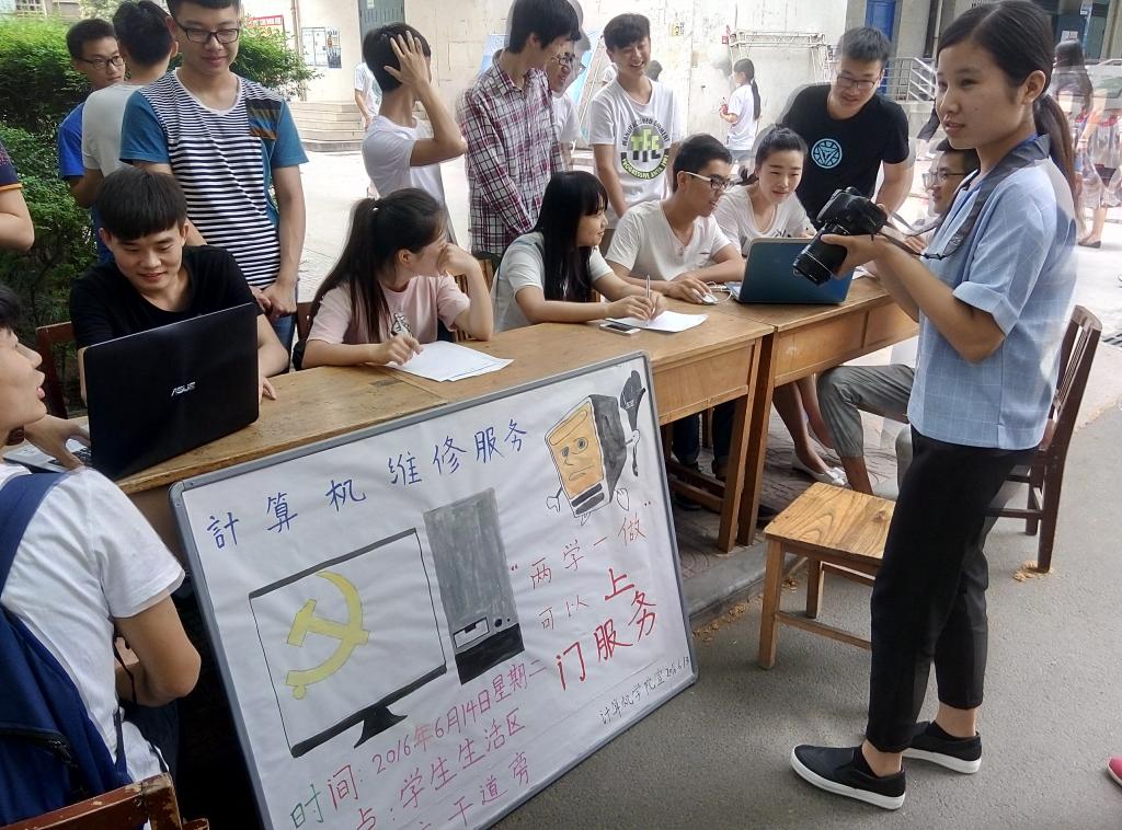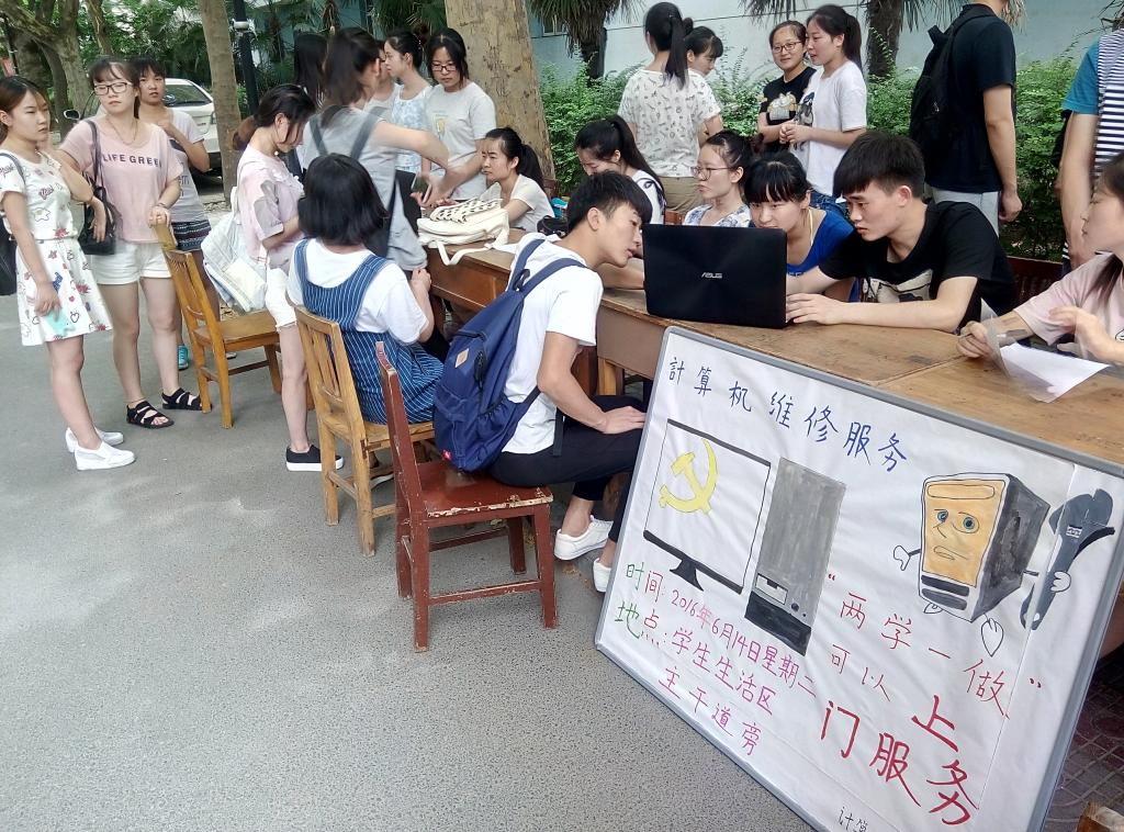 6月14日,今年会jinnianhui官网学生党支部组织53名预备党员和积极分子开展计算机服务站活动,主要是针对全校师生计算机方面的问题进行解答和维修。