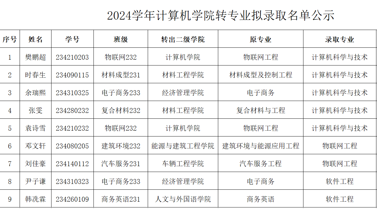 根据转专业文件相关要求及综合考核,对2024学年今年会jinnianhui官网转专业拟录取名单进行公示,公示期三天,如有异议,请电话至029-84252366.